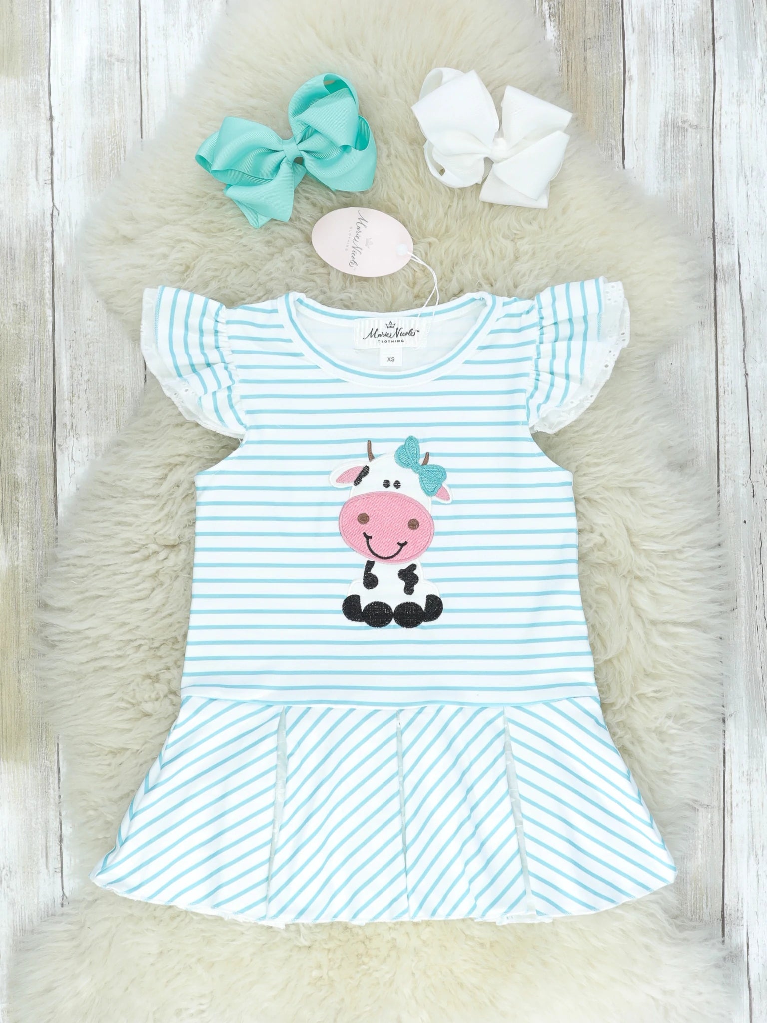 MOO-ooove on over! We've got a cute new cow in town! We love the ruffle and lace details on the blue & white cow striped dress!
